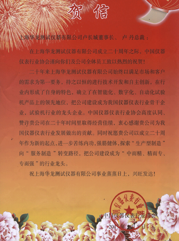 中國儀器儀表行業協會致上海華龍成立二十周年賀信