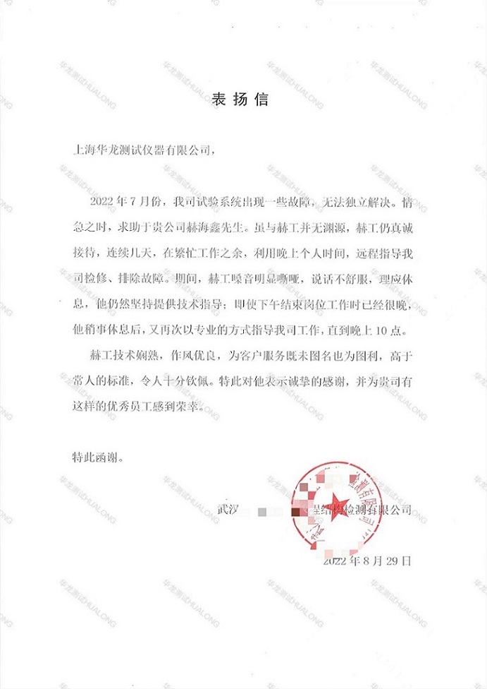 品質(zhì)與服務(wù):客戶發(fā)表揚信對華龍的技術(shù)服務(wù)予以肯定